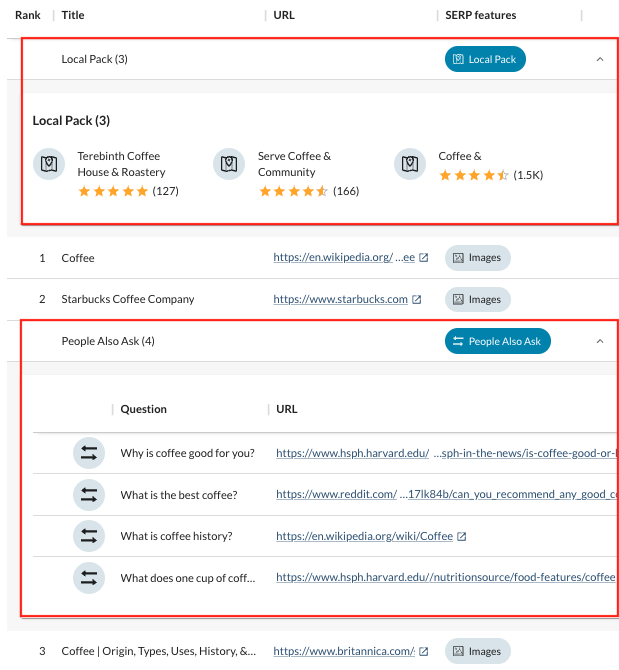 For example, thanks to this upgrade and our improvements to the SERP Analysis section of our Explore by Keyword tool, you can now see the appearance of the local pack and People Also Ask (PAA) SERP features among the top three organic results for the keyword “coffee,” including specific details about those features, such as the questions and ranking URLs within the PAA.